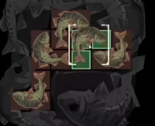 谜题D:需放入5条鳕鱼,按图示拼凑即可。完成后奖励筋线轴,该道具适用于近海与浅水区域捕捞,且能提升6%的捕捞速度。