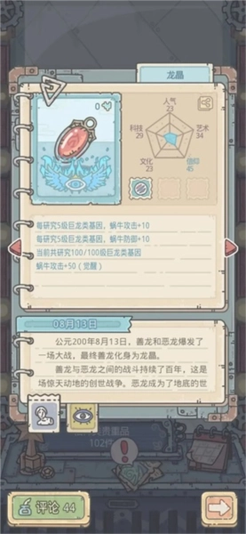 ③ 全能强化:完成研究后,可提升蜗牛的五维属性,同时增加探索过程中获得神龙宝箱的概率。