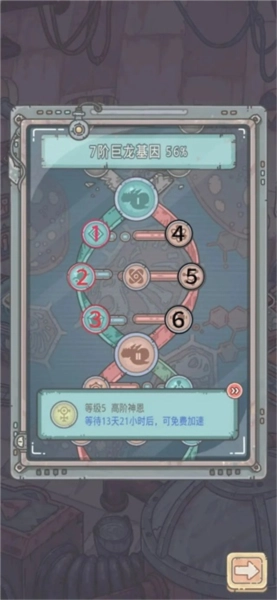 中间格是罗盘增强,总计能研究三次,每次研究会让旅行和虚拟罗盘的效果分别提升60%、80%和100%。巨龙的强大之处,在于它各方面的加成幅度都更大,而且六个形态的罗盘增强效果是对所有形态都生效的——所以强烈建议优先研究这个分路的DNA,不管是前期挑战使徒,还是后期实现制霸,它都特别实用!