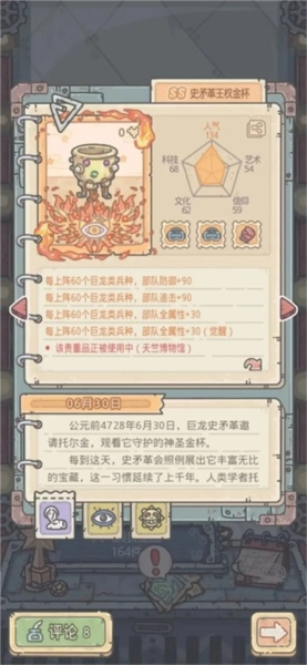 研究结束后,成功获取史矛革王权金杯的贵重碎片,前后累计5次,总共得到280个碎片。其觉醒属性为:每上阵60支巨龙兵种部队,可使防御提升90点、追击提升90点,同时全属性增加60点;此外还解锁了最后的巨龙幻境,对应的技能如下:
