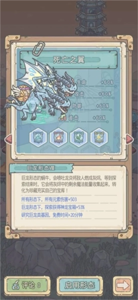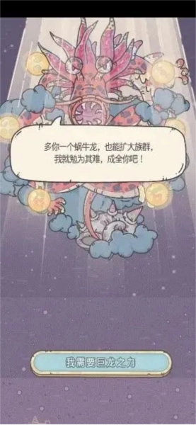 当启用巨龙形态时,蜗牛的攻击、防御、追击和生命值都将获得巨额加成(该加成不受阶数提升的影响而产生差异),在探索过程中神龙宝箱的产出数量会有所增加,并且研究巨龙类基因时会自动获得一定时长的免费加速。