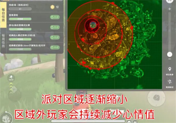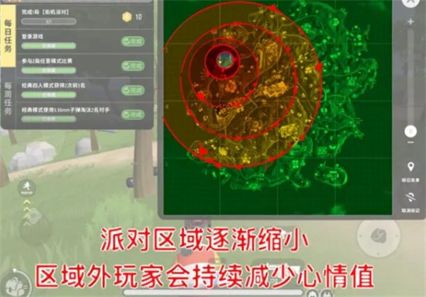 地图上会以“圆”的形式标识出派对区域,该区域会逐步收缩。玩家需向派对区域内移动,若处于区域外,心情值将持续减少(可借助道具恢复,一旦清零就会直接出局)。派对区的范围越小,区域外心情值的下降速度就越快,因此玩家们要时刻关注派对区的范围变化,尽快到达安全区域内。