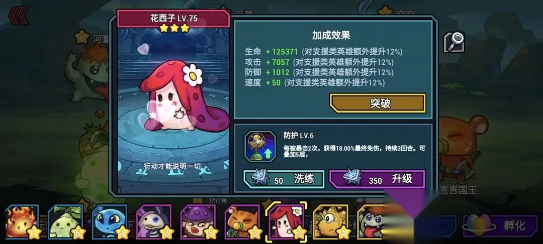 河童:技能效果对火系英雄与进攻型英雄生效,建议优先洗练撕裂(目标身上回合盾数量越多,造成的伤害就越高;若能确保输出目标头上有三个及以上回合盾,此属性必选;拥有福尔摩斯的玩家也建议必选),其次考虑攻击和速度属性。