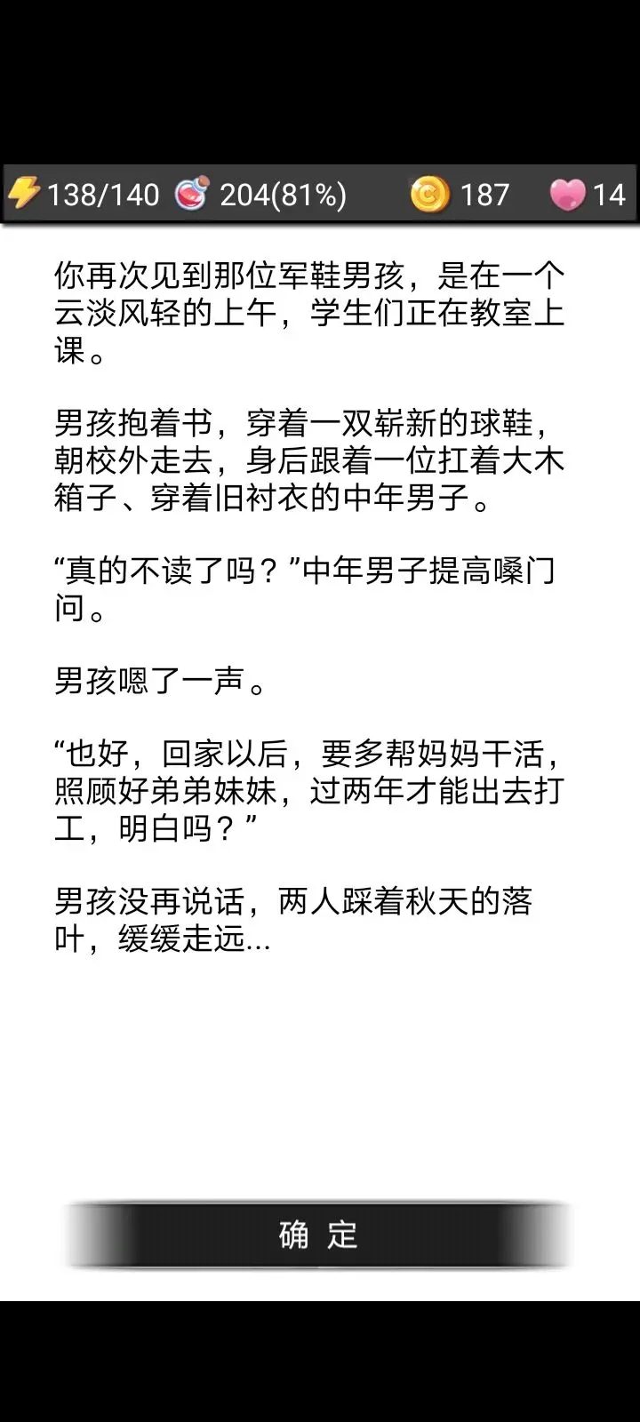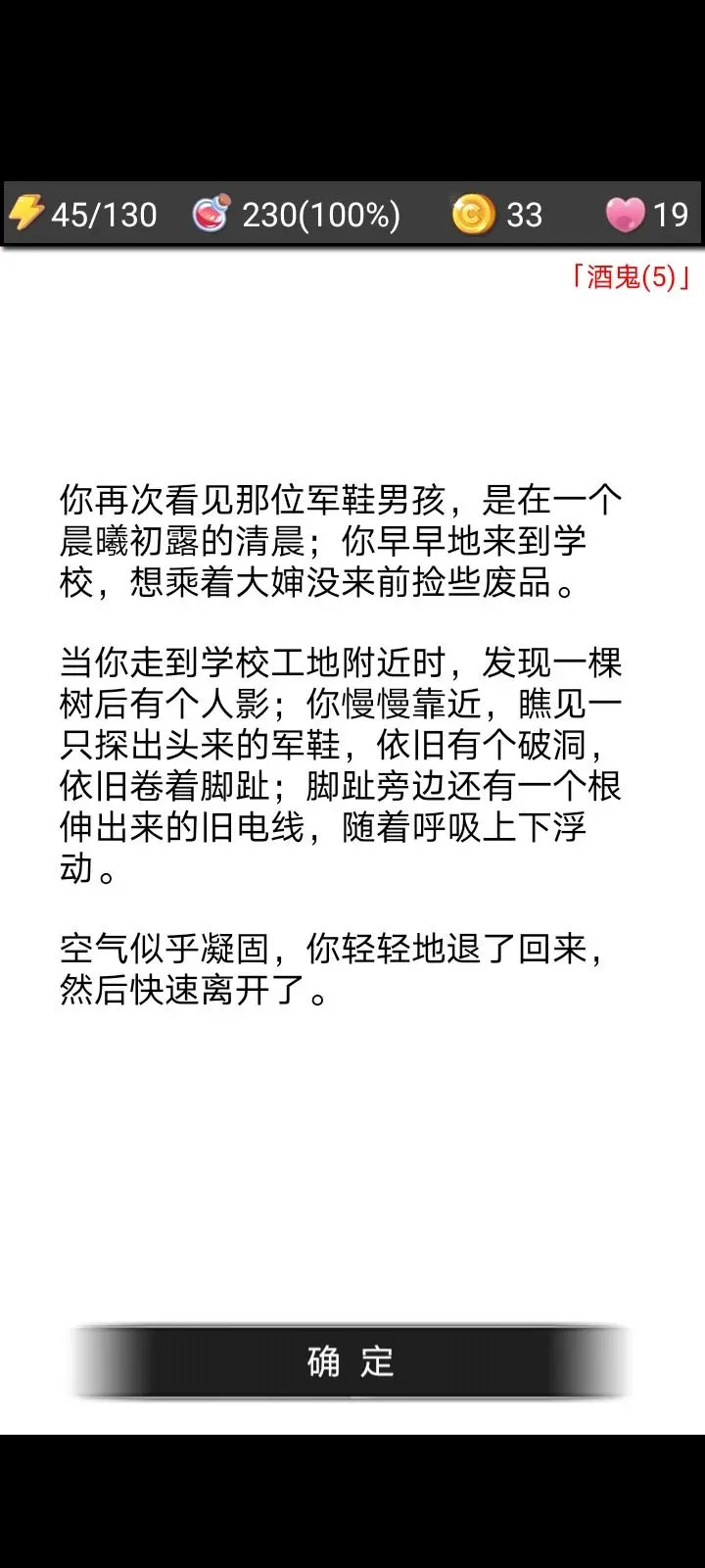 打完这个怪物后,其他像蚊子、小混混之类的小怪就都能打了。接下来要做的是加帐篷,加到130左右就行,高低差一点也没关系。之后会碰到一个小孩给你棒棒糖之类的东西,还会遇到假广告——得注意这个广告,要是接了去那里,你的血是不会自动加满的。不过我当时已经成功击败这个boss了,所以后来再去接这个广告,打起来也很轻松,包括后面遇到的醉鬼,也都能轻松搞定。之后我又加了一次皮衣,这时候就有两层皮了,再碰到换烟的,就凑到三层皮了。还会遇到一个小姑娘,她妈妈会给你两块钱,拿了也没关系,本来就是流浪汉,而且拿了对结局也没影响。这一天过去后,就要打刀疤了。我当时买了些小刀和木棒,如果麻衣刚好差一次就能买的话,那就买,还是那句话,自己衡量着来。