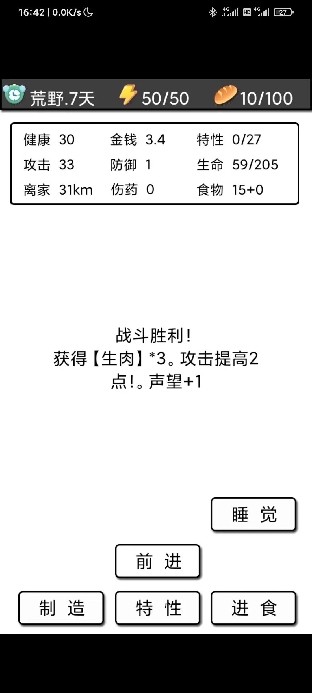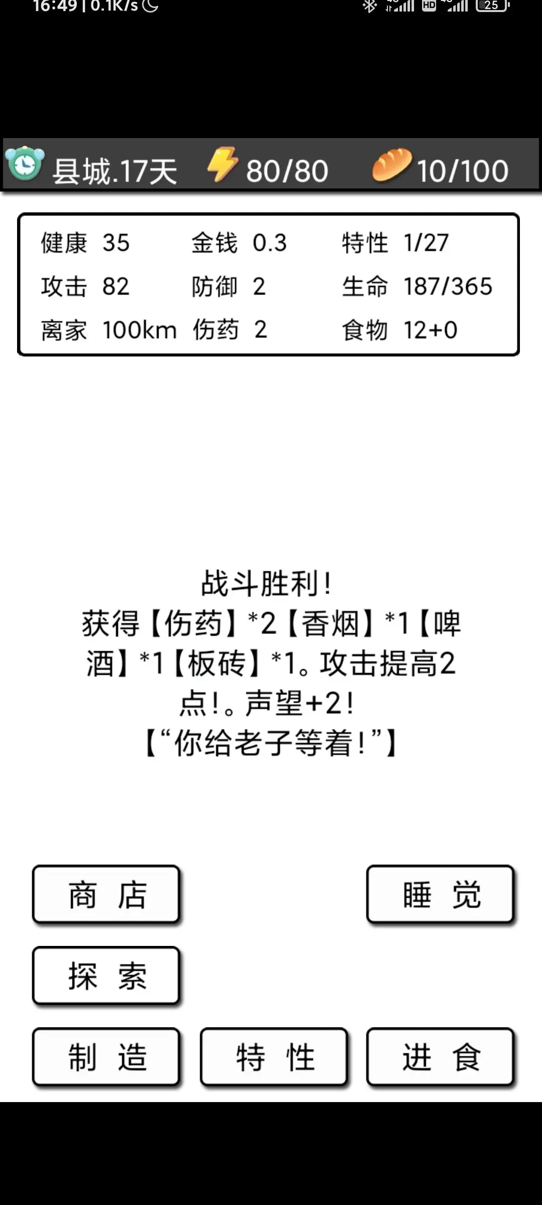 然后加两次帐篷,其他资源优先加木棒和麻衣;要是担心后续战斗难度大,也可以选择不加帐篷。到了县城后,根据实际情况购买木材和麻衣。需要注意的是:木杖每次增加10点属性,刀每次增加20点属性且带有吸血效果,要结合自己的钱数权衡选择。另外,木杖加得多了成本会变高,不如买刀性价比高——比如只有三块多钱时,刚好能加一次刀;但如果买木杖,即便已有三个木头,每次仍需十六块,差不多也只能加一次木杖。至于皮衣,不熟悉玩法的建议暂时不买,买它主要是为了后期打怪时减少掉血。