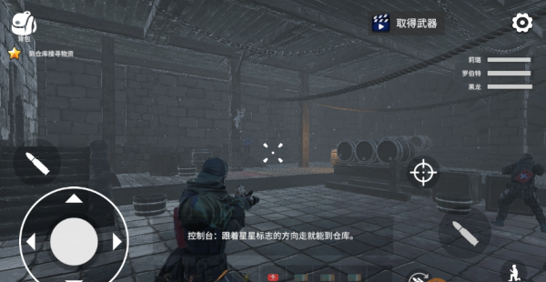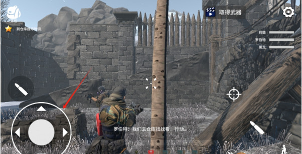 点击左侧轮盘可操控角色移动,右侧设有射击、换弹、下蹲等按键。