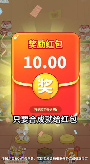 确实是真的,不过到头来也就赚个几毛钱。这是一款主打0.3元红包的小游戏,玩家在游戏里能靠合成可爱的宠物玩具、观看广告之类的途径获取红包奖励。虽说红包显示的金额看着挺可观,但提现时是按比例来的,所以最后实际能拿到手的也就只有0.3元!
