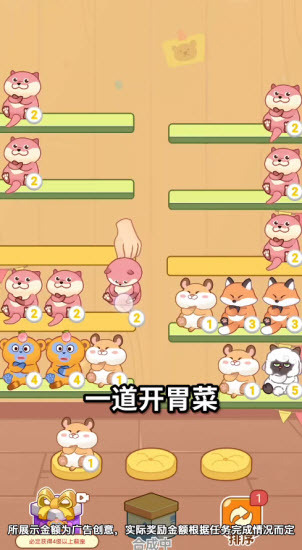 合成3级狐狸能赚一毛钱,合成4级金丝猴能赚三毛钱,接下来要合成10级熊猫,奖励是88,不过这个钱是赚不到的!