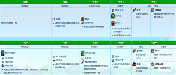 钓鱼技能的提升途径是使用钓鱼竿/杆捕鱼、捞取垃圾,或是收获蟹笼。该技能每提升一级,会带来以下效果:钓鱼竿熟练度增加1点,钓到的鱼的最小尺寸(英寸/厘米)有所提升,钓鱼条的高度也会增加,同时鱼咬钩前的等待时间会缩短,此外还能提高所发现鱼类的品质。