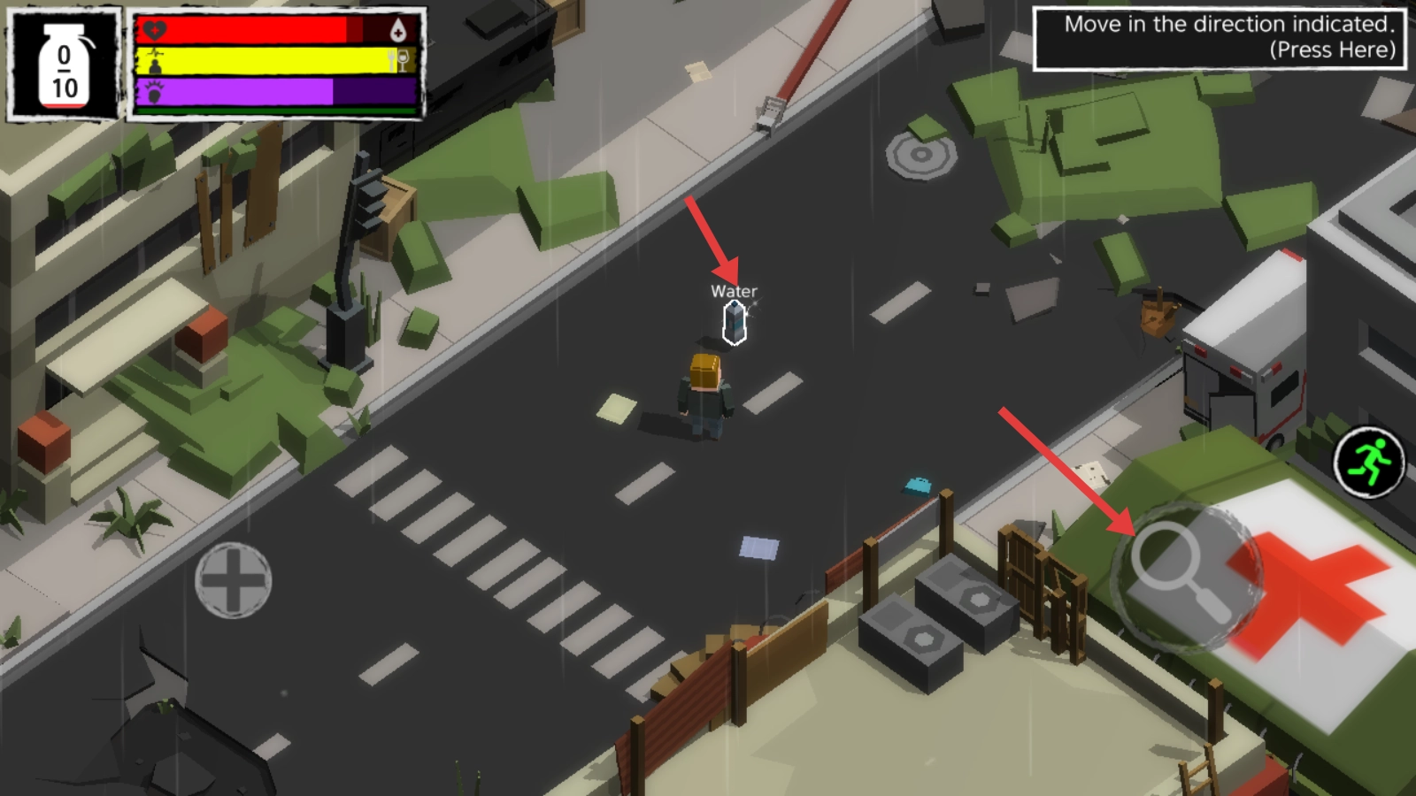 2. 轻点放大镜图标,寻觅并收集“Water”等生存物资。