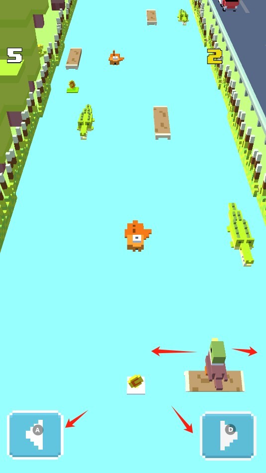 这条河虽说宽度不小,河水里却藏着形形色色的奇特物件:鳄鱼、金币、木板、障碍桥之类的都有。玩家能够把这些道具都好好利用起来,另外还能通过左右移动的方式避开危险。