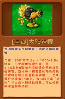 特点:不会受到耀桃炸弹的伤害。每隔2.5秒发射8颗阳光樱桃,造成无衰减的范围伤害,同时还会向当前行血量最高的僵尸投掷一颗真正的阳光耀桃炸弹,该炸弹击中僵尸后会掉落25点阳光。每30秒会召唤“太阳”,并生成一颗随机陨星。此单位的技能可以通过使用咖啡豆来释放。