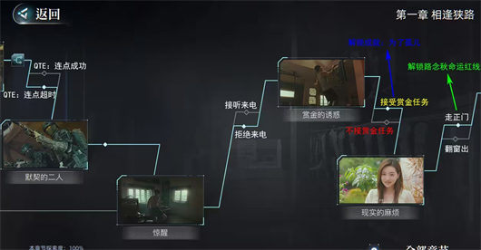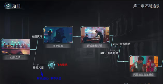 2、诊所抉择环节,醒来后若选择“分别行动”路线,将触发屋顶大逃杀剧情;若选择“一起撤离”路线,则解锁成就【一个都不能少】,后续若不操作QTE还能解锁成就【送快递】。在“分别行动”路线的屋顶大逃杀中,不操作QTE会解锁成就【插翅难飞】。诊所抉择2的反击选项,无论选哪个结果都相同,都能获得吊牌(ps:我尝试选不同选项最终都拿到了吊牌,不确定是否存在bug)。诊所抉择3的线索分支中,是否获得吊牌会导向不同的路线。