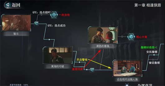 6、打斗事件结束后,若选择“开启警报”,之后回家并请求詹娜帮忙找人。此时若选择“安抚詹娜”,会触发【詹娜好感度+1】;若选择“催促詹娜”,则不会获得好感度。若选择“直接回家”,会见到尚薇并得知相关消息,但随后会遭到黑衣人刺杀导致失败。ps:这里似乎存在bug,关于“黄海的可疑”这部分,我尝试了两次“直接回家”的选项,才进入到“黑色的蔷薇”剧情。
