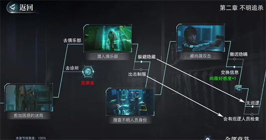3、返回查找线索,前往诊所,完成寄送。前往俱乐部,若遇到保安时选择“躲避隐藏”,后续与尚薇相遇后不会触发保安巡逻。若遇到保安时选择“出击制服”,后续与尚薇相遇后会触发保安巡逻搜查,主角需和尚薇一同躲避搜查。与尚薇相遇时,选择“交换信息”,将获得【尚薇好感度+1】的反馈。