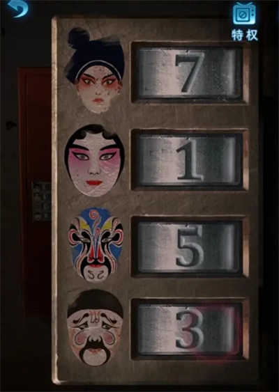 1、剧情结束后,先留意消防栓的密码由四个脸谱组成。第一个是武生角色,第二个从延伸到颧骨的胭脂能判断出是旦角,记为旦;第三个大花脸是净角,按照生旦净丑的顺序推算,最后一个自然就是丑角了,不用特意逐个去记。