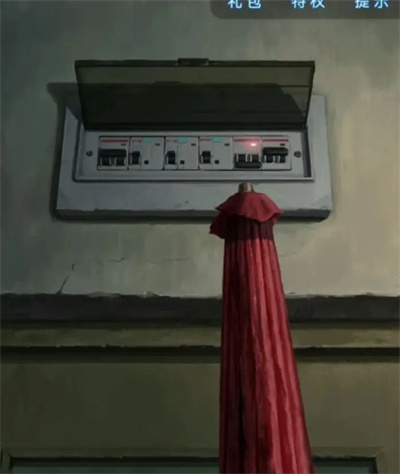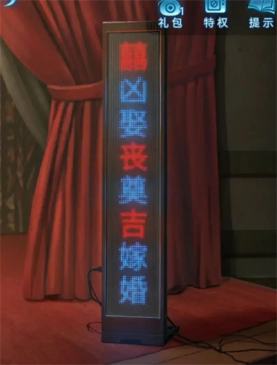 6、这里要特别留意房间左上角的电表箱——之前在舞台场景点击屏幕时会提示未通电,所以这个电表箱是关键。用纸伞打开电闸后,外面的屏幕应该就亮了,退出后观察屏幕,会发现有两组字在交替变化,需要记住红色字及其对应的位置。因为盒子的第一个密码是红色的“喜”,所以从红色“喜”所在的组开始:红喜那一组是1喜、4丧、6吉,另一组是2奠、5婚、7嫁。把这些按数字顺序组合起来就是1喜、2奠、4丧、5婚、6吉、7嫁,对应的密码顺序就是喜、奠、丧、婚、吉、嫁。