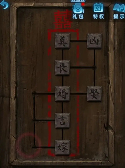 7、进入座位场景后,先查看左边座椅中间位置的木盒子。把木盒子上的字块调整成“喜奠丧婚吉嫁”的顺序,打开盒子就能拿到化妆笔。拿到化妆笔后返回坟墓房间,点击镜子,用化妆笔蘸取镜子前的油彩,这样就得到了红笔。接着点击左边的门,完成一个一笔画小游戏就能开门进入新房间,这个房间就叫戏台房间。