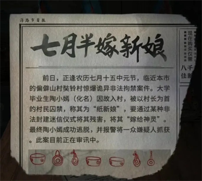 8、进入房间后,先查看右侧桌子,取走小鼓槌后再查看报纸,触发剧情。剧情结束后会回到戏台房间,此时先将“开锣大吉”贴在左边的箱子上,接着查看右边的报纸,会发现报纸底部有一行红笔绘制的简笔画,简笔画下方标注的乐器顺序,就是打开箱子所需的音乐顺序。