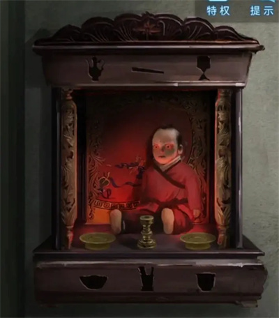 10、拿到娃娃后出门到外面场景,会遇到女鬼唱戏的小惊吓,随后跟着剧情再次进屋。调查右侧的小戏台就能发现线索,需记下顺序:黑高、蓝低、白高、红高、黄中,这应该对应着外面舞台上的蝴蝶线索,先记下来。再次走出房间,将人偶娃娃放置在右侧佛龛上,娃娃变脸后会给出位置线索,第一行是酒壶、长条、高脚杯,第二行是小船、小狗、茶杯。
