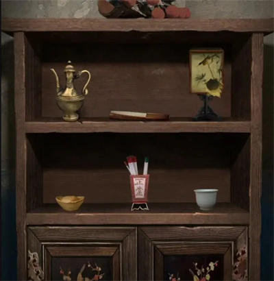 11、再次进入房间后,这次把注意力集中在左边的柜子上。通过观察柜子上物品的形状进行推理,能得出第一格的摆放顺序应该是酒壶、折扇、台灯,第二格则是元宝、插着笔的笔筒、茶杯。等调整好这些物品后,台灯会裂开一个洞,从里面掉出一个小步球,这就是娃娃的第一个玩具了。