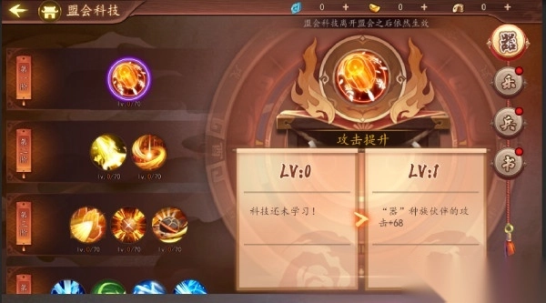 从技能介绍能够看出,其对应的是四大阵营不同科技的提升。每一阶的开启都有不同的盟会等级要求,所以盟会等级越高,可选择的科技也就越多。鉴于科技升级需要耗费大量的科技点,建议在前期有针对性地选择相应科技进行提升,以最大程度提升整体实力。自身拥有哪些伙伴是选择科技点的关键,因此建议前期优先提升自己使用较为频繁的伙伴,这样能够快速提升实力,便于获取更多资源。