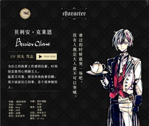 作为执事,他对自身的工作满怀自豪,并且十分留意主人的日常起居,温柔而值得信赖,在其他执事当中很受信任。尽管他常常给人一种神秘的感觉,可实际上他是个相当低调的人。
