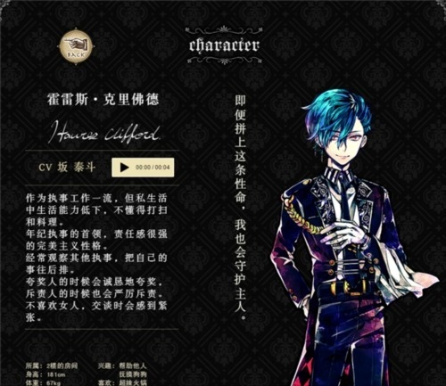 作为执事团队的领头人,他在工作方面表现得无可指摘,不过在日常生活里,打扫卫生和烹饪饭菜这些事却不太擅长。他责任心很重,是个追求完美的人,尽管外表看上去严肃认真,内心深处却满是对他人的关怀。