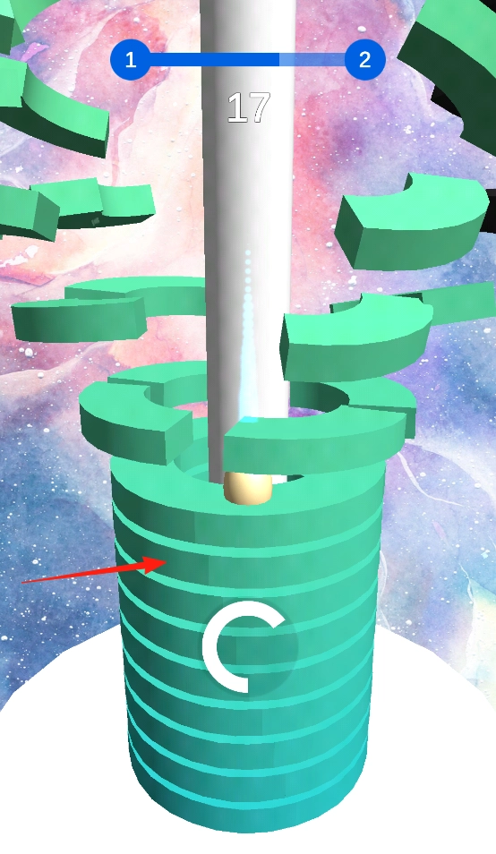2、操控金色小球沿着白色柱子向上攀爬,需避开旋转的青绿色障碍物;数字17代表当前所处高度,进度条则提示距离下一个目标的剩余距离,若碰到带有C字母的圆柱,会触发特殊效果。