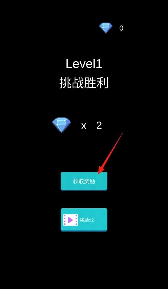 3、挑战胜利后会直接发放2颗蓝钻石,点击“领取奖励”即可将其存入账户;若想获取双倍奖励,可点击下方带有播放图标的按钮,但需要观看完整广告才能拿到额外的那部分奖励。