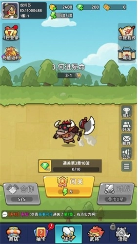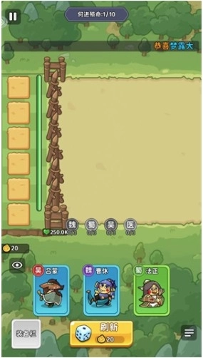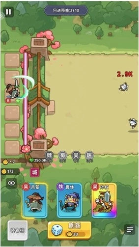 进入游戏主界面后,点击【闯关】按钮就能进入战斗地图,挑选关卡开启你的冒险旅程。 2、刷新召唤武将,随机从三个选项中选择一个: