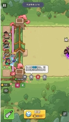 每场战斗开始前,你可以点击【刷新】按钮来召唤武将,系统会随机生成三位英雄让你挑选,阵容的合理搭配对胜利起着关键作用。 3、战胜怪物能够获取金币,进而持续对阵容进行强化: