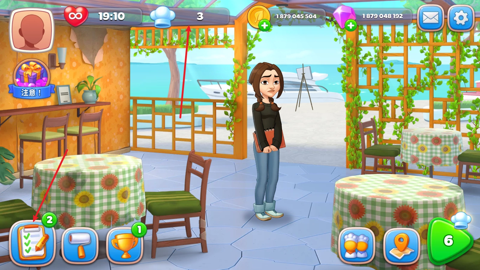 1、装修过程中要消耗厨师帽,这些厨师帽得通过闯关来获取,第一步先点击左下角的按钮。