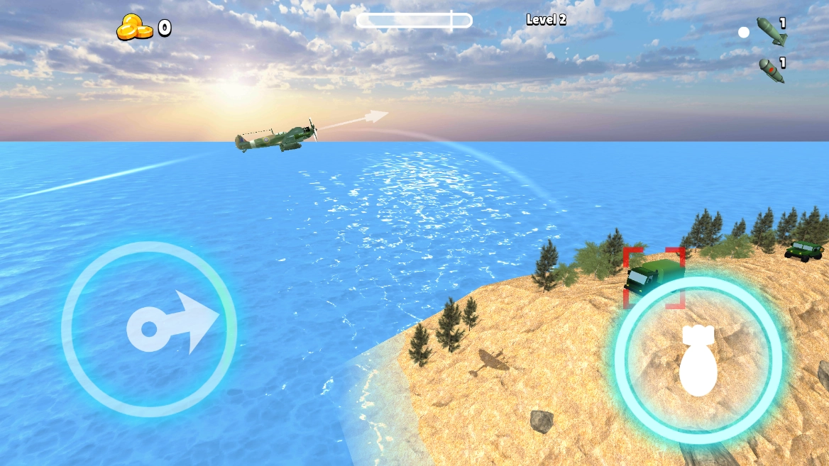 2、把飞机炸弹的抛物线调整至对准运输车,将炸弹投掷过去将其炸毁;要是你的飞机配备了机枪之类的装备,也可以直接瞄准车辆进行扫射。