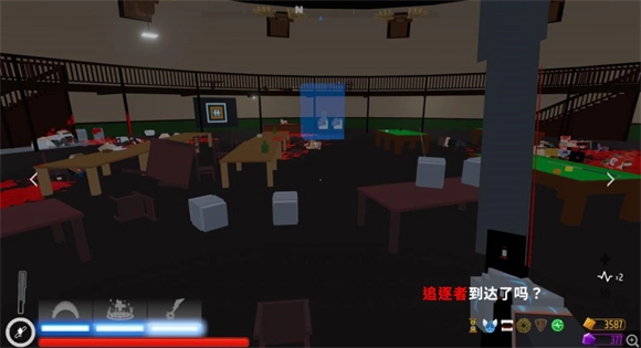 4、当追逐者出现时,地图会陷入完全的黑暗,玩家只能凭借偶尔显现的地图模型绿色线条(这是这几张地图独有的显示效果,毕竟是诡计者脑补构建出的地图)来照明辨识路线,因此若想获取武士刀,不建议在迪斯科地图进行尝试,这张图的中间区域没有围栏作为遮挡,一旦掉下去,尽管不会立刻死亡,但会因从空中坠落而扣除一部分生命值。