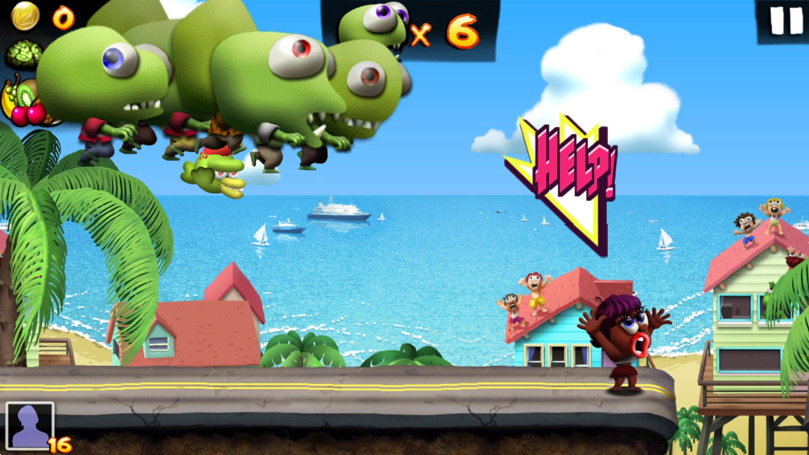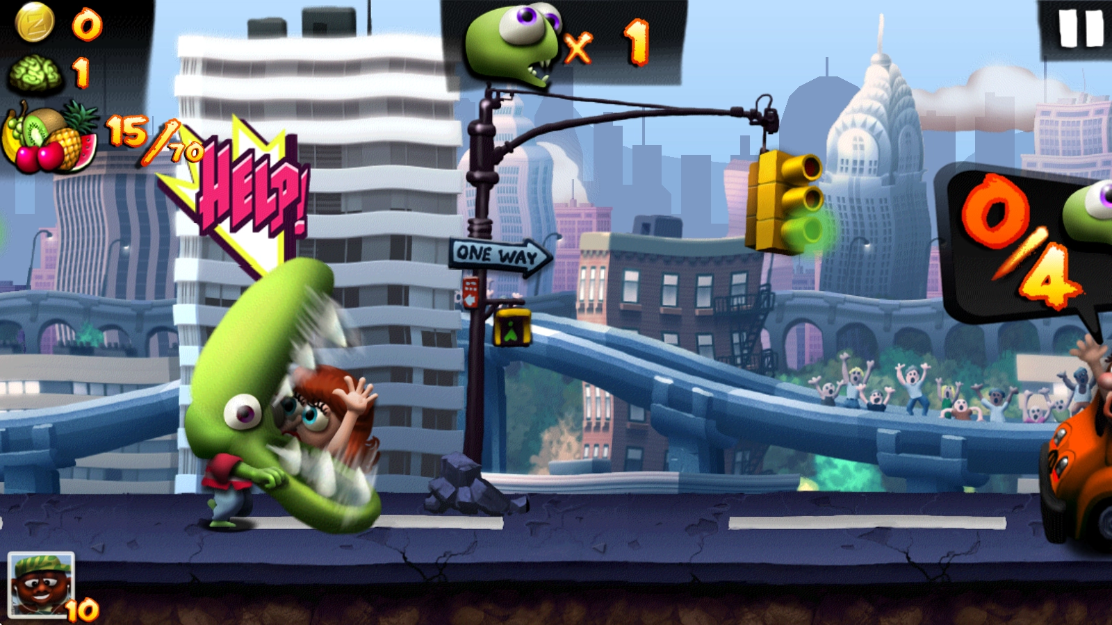 僵尸尖叫(Zombie Tsunami)是一款以僵尸为主题的趣味横版跑酷游戏。在游戏里,我们操控的僵尸会在道路上一路狂奔,通过吞噬人类来壮大自己的队伍,不过得留意沿途的障碍物和陷阱,每次撞上都会减少队员数量!除此之外,我们还能收集路途中的白色问号箱子,它会提供随机的强化效果,像巨大化、合体或者变身之类的,让你可以横冲直撞,无视任何障碍!现在就来看看你能跑多远吧!