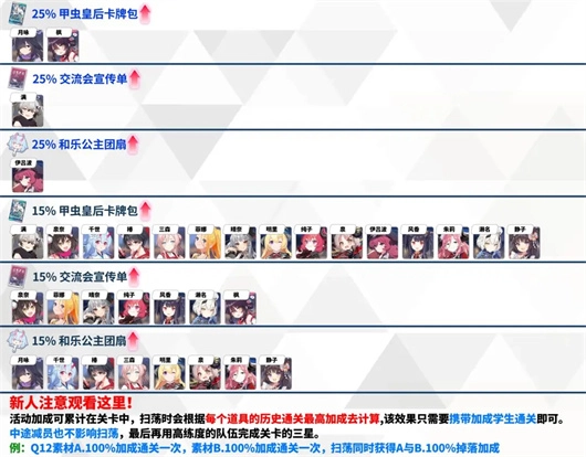 本次活动的加成学生信息如图所示,当携带这些学生完成关卡通关时,能够提升对应的活动掉落物获取量。