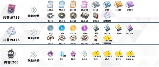 1、本期商店的兑换列表见上图,忍佩洛玩偶商店的物品可以随意兑换完。另外两个商店则建议优先把神秘古物的素材兑换齐全。