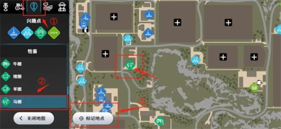 1、培养马匹前需先解锁马棚,马棚的解锁位置在地图左上角,对应一个绿色菱形的马匹图标;若要前往此处,只需点击【标记地图】,游戏内便会生成地点指引。