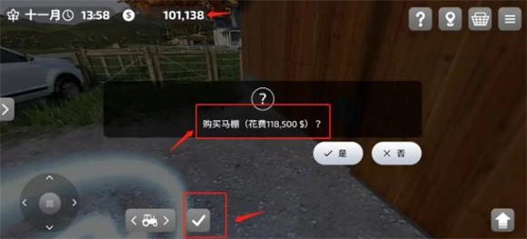 2、马棚的售价是11850美元,我们新游戏的初始金币为100000美元,所以这笔钱是不够的。新手可以先玩一会儿赚点钱,或者通过卖掉载具的方式凑够钱后再来购买。