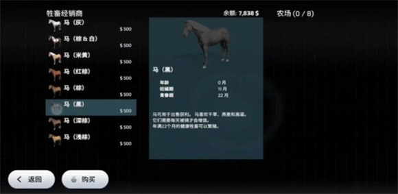 3、购买马棚后,马棚旁会出现一个图标,点击该图标或前往地图右上角的动物商店均可购买马匹。游戏内的马匹仅颜色存在差异,其他属性完全相同,统一售价为500美元,若选择快捷购买则需额外支付300美元;但如果驾驶动物运输车到右上角的动物商人处购买,就能节省这300美元的运输费用。