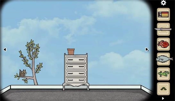 2、抽屉柜里,第一个与第三个抽屉装着提示,最后一个抽屉内有一个砝码。点击左上角放大后,每朵云移动到指定位置就会化作特定形象,等所有云都完成变化,就能获取最终的钟表提示——七点二十五分。