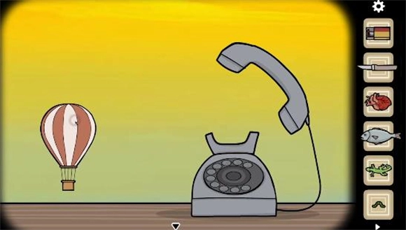 4、前往电话处接听电话,接着点击“rise up”,并点击弹出的热气球。随后切换至立钟场景,将热气球放大后用火柴点燃,等热气球升起,再用小刀割下袋子,最后打开袋子就能获得天平、沙土和一个密码盒。