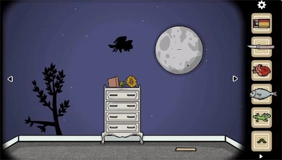 7、到了晚上,抽屉柜那儿停着一只猫头鹰,点击它就会飞走,之后立钟上会多一只猫头鹰。另外,旁边的月亮能用小刀划开,划开后拖动里面的眼睛四处查看,就能看到四个密码,这组密码是用来打开立钟下方盒子的。