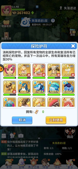 另外,探险过程中可使用“探险护符”,它能回复所有宠物的全部生命值并复活所有阵亡宠物,同时让所有宠物在下一场战斗中的攻击力提升30%。