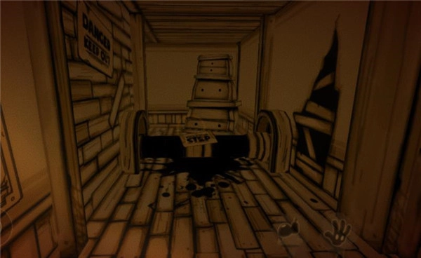 走到出口附近那条黑色墨水河的时候,撞见了一个吓人的班迪恶魔!得赶紧往回跑!记住要往回逃到拐弯的地方,因为只有那一条路能走