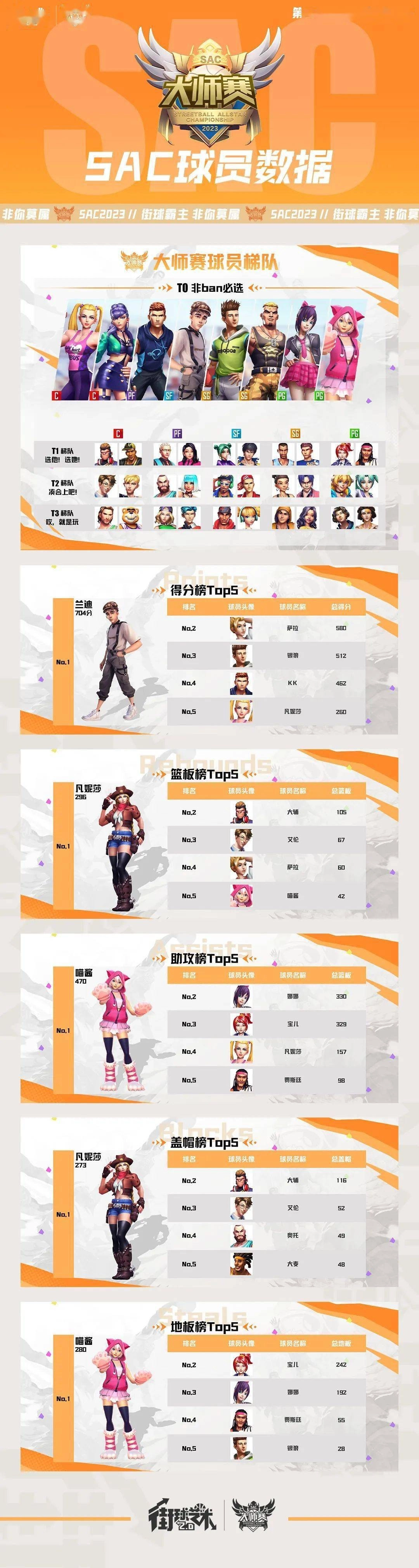 我们依据球员上场次数的统计情况,划分出大师赛的球员梯队层级。其中T0梯队属于那种在比赛中要么被禁用、要么就一定会被选到的存在,具体包括——