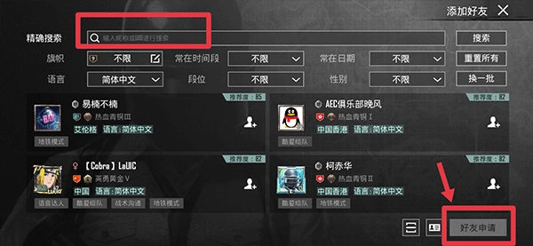 3、最后输入好友的昵称或id进行搜索,再点击好友申请等待同意吧