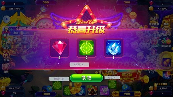 锁定炮位后,捕鱼时会更省力,但也常常容易错过你想捕获的大鱼品种;要是你的战绩出色,就能获得升级奖励,点击领取就行。