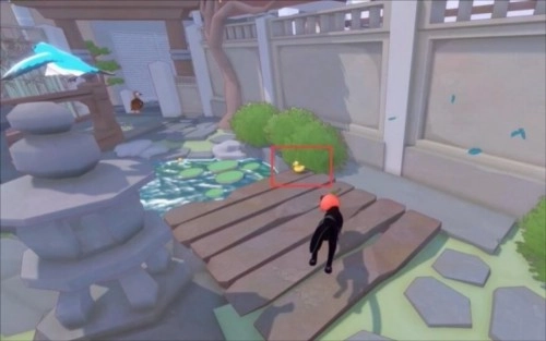 另一只位于池塘边缘,靠近墙体的一处小花丛下方,具体位置可参考图示中方框标注的区域。